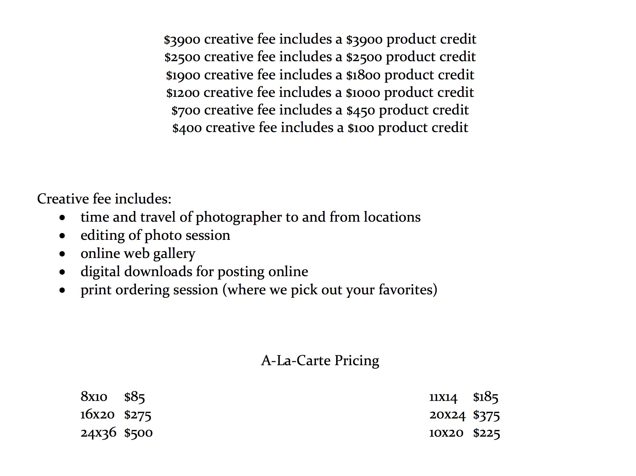 There is a $100 montage fee for us to assemble the Montage piece, in addition to the session fees listed to the right. We recommend a package of at least $700 so you will have enough print credit to get your large wall art. The montage fee is waived for packages that exceed $1200.